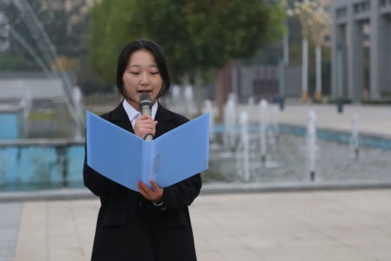 学生代表建环2401班文源同学发表了国旗下的演讲,她演讲的主题是《七十五载长歌奋进,赓续前行再奏华章》。“我们要在祖国的怀抱中,以青春之名,书写热爱,以心中红星,献礼中华。”她号召学生们在祖国的大地上挥洒青春的汗水,为祖国的繁荣贡献自己的力量,将最为璀璨的青春之年华,毫无保留地奉献给充满希望的青春之中华!