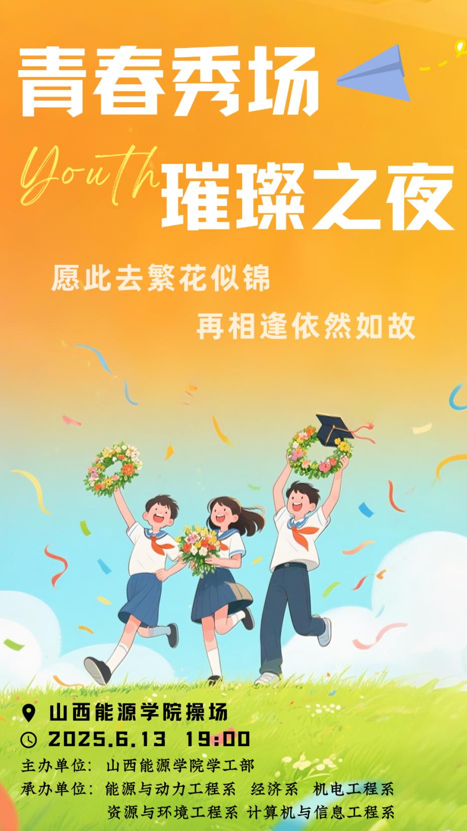 蝉鸣渐起,盛夏已至,青春的故事也悄然来到终章。在这繁花相送的毕业季,能动系携手经济系、机电系、资环系、计算机系,共同打造“青春秀场,璀璨之夜”毕业晚会。五系齐心协力,以舞台为笺,以热情为墨,为大家书写一场专属的青春纪念册,致敬过往,奔赴新程!