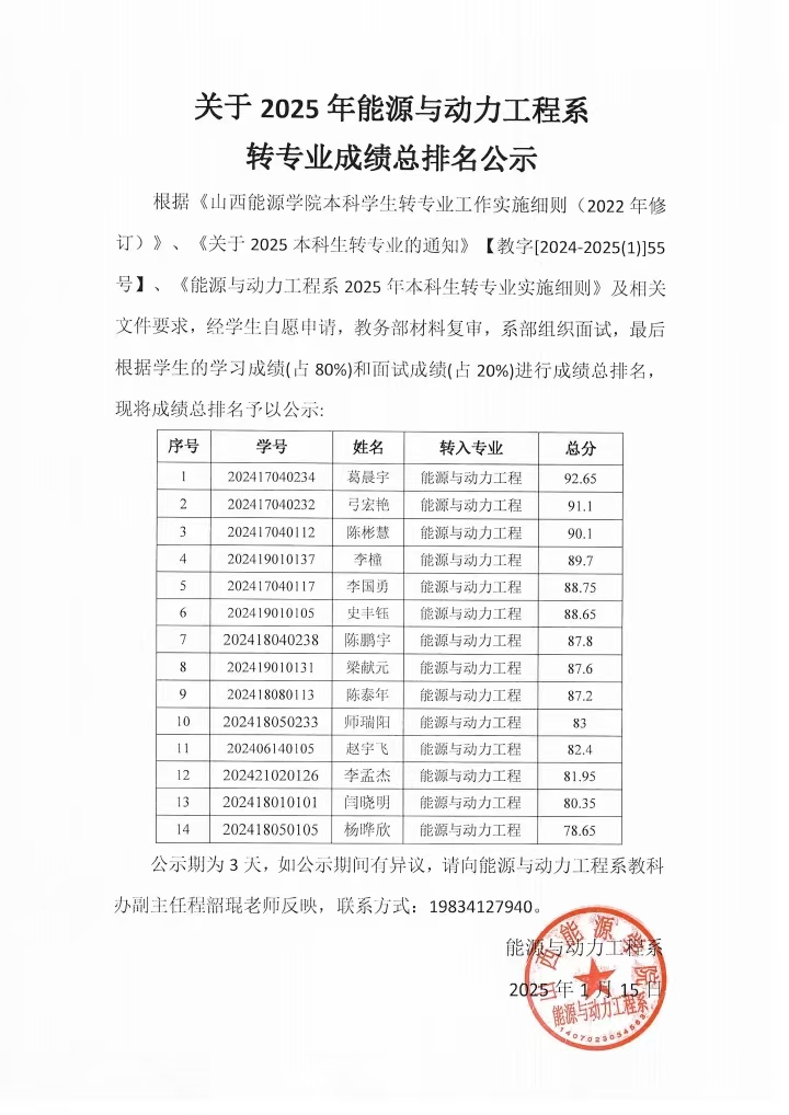 关于2025年能源与动力工程系转专业成绩总排名公示