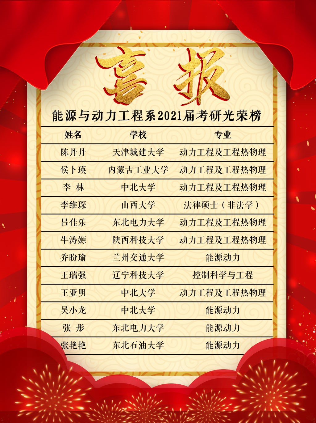 “星光不负赶路人,天道酬勤佳音来”。随着2021届全国研究生入学考试复试结果的陆续公布,能源与动力工程系考研录取喜报频传。据统计,我系共有四十人参加研究生考试,其中有十二位同学成功上岸,取得优异成绩,获得理想录取通知书。