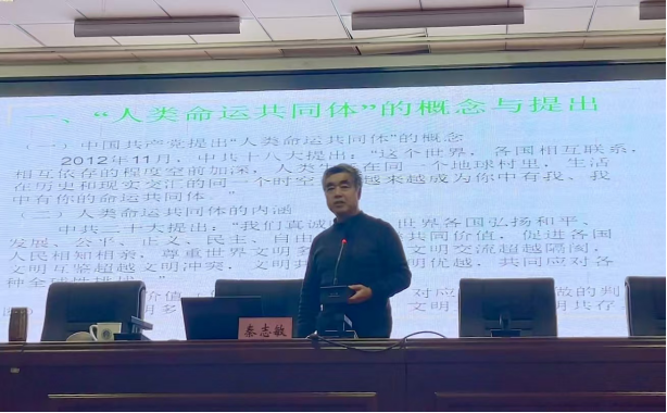 秦志敏教授围绕党的二十届三中全会中关于“人类命运共同体”的重要论述,从“人类命运共同体”的提出、人类命运共同体的基础、人类命运共同体的构建三个部分进行深入讲解。