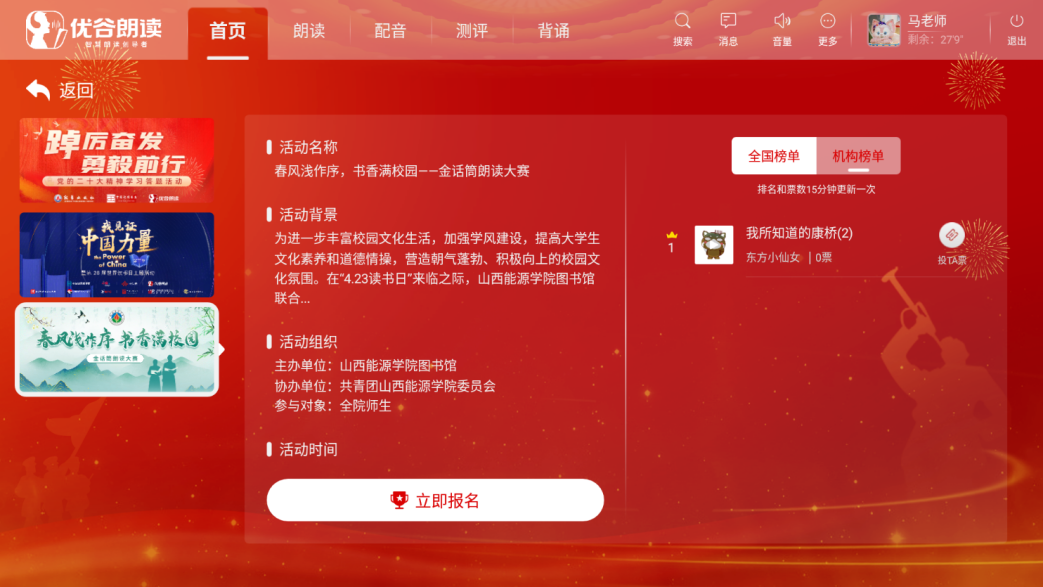 ③点击朗读亭屏幕上【我已填写】→【去朗读】,在活动推荐的素材分类中,选择喜欢的篇章进行朗读。