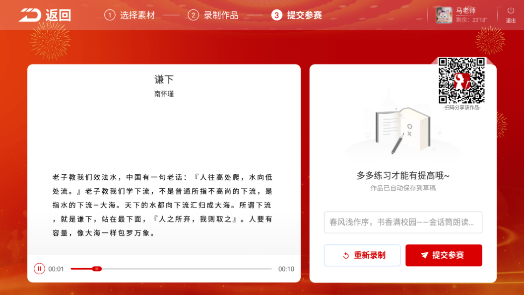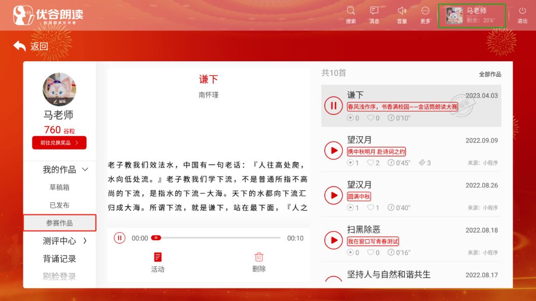 注:如不满意录制作品,可双击头像,点击参赛作品,可以删除。