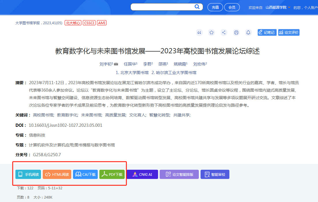 在检索框中输入要检索的关键词,点击检索,即可获得需要的结果。找到所需文献后,点击题名可以进入文章的知网节界面,确定该文献符合检索策略,可点击文章下方的CAJ(首次使用需安装CAJViewer浏览器,可到中国知网首页下方“CNKI常用软件下载”处进行下载安装程序)或者PDF下载即可进行资源全文下载。