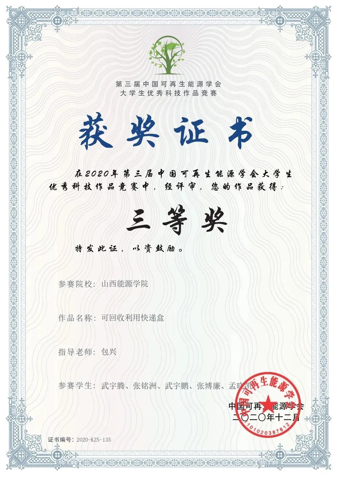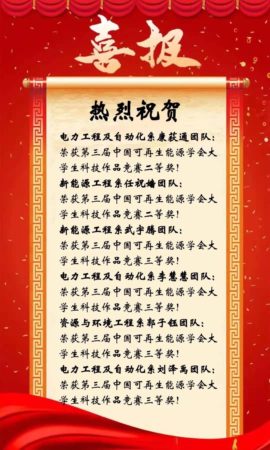 第三届中国可再生能源大学生科技作品竞赛以"绿色能源、创新引领"为主题,紧密围绕国家能源与环境政策,紧密结合国家重大需求,得到了各省教育厅、各高校的高度重视。此次竞赛中,经过层层筛选,最终有130件作品进入决赛。在为期两天的决赛中,我院参赛队员围绕主题,展开思想碰撞和创意比拼,充分展现了能源学子理论与实践相结合的创新成果。经过线上分组答辩和答辩委员会综合评议的激烈角逐后,我院学子取得二等奖两项,三等奖四项的优异成绩。