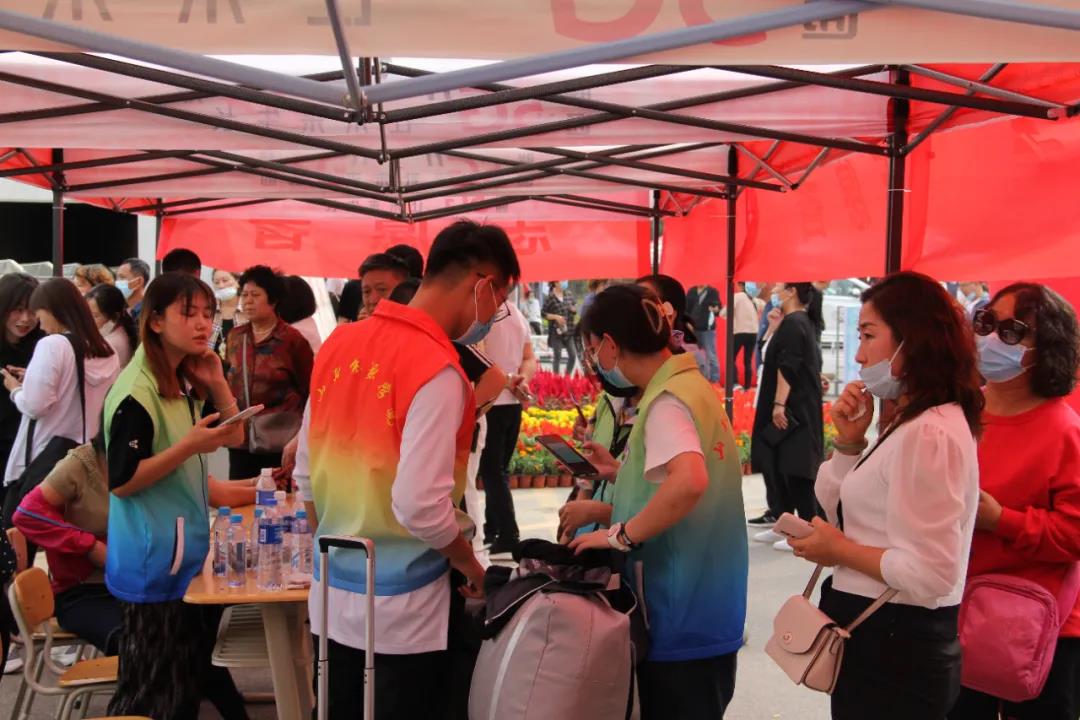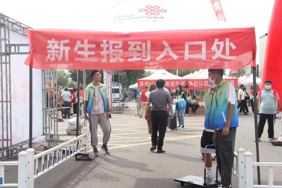 新生和家长一下车,就能看到迎新工作人员高举着指示牌热情的欢迎他们的到来。来到服务点后,工作人员进行健康码的检查,以及体温的测量。