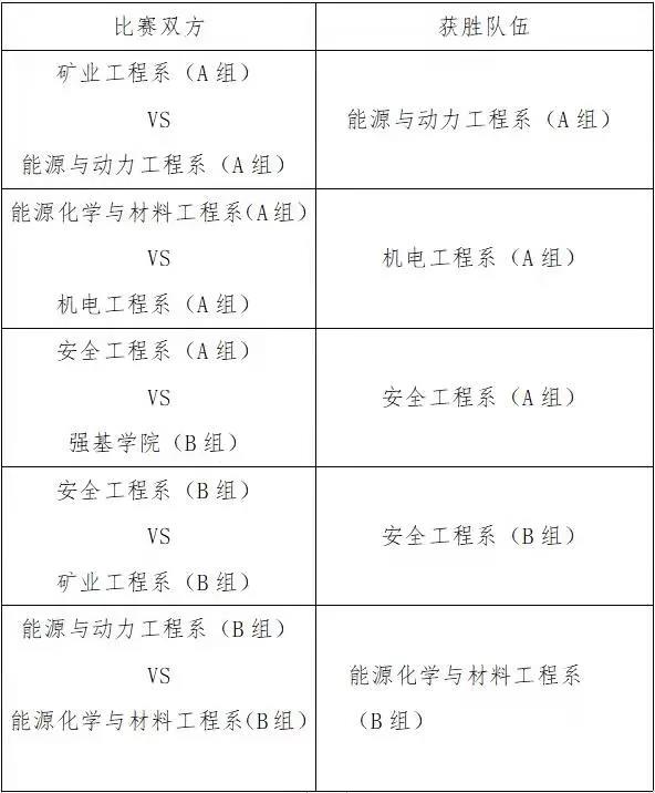 经过激烈的角逐,本次复赛终于落下帷幕,获胜队伍分别是:能源与动力工程系(A组)、机电工程系(A组)、安全工程系(A组)、安全工程系(B组)、能源化学与材料工程系(B组)。