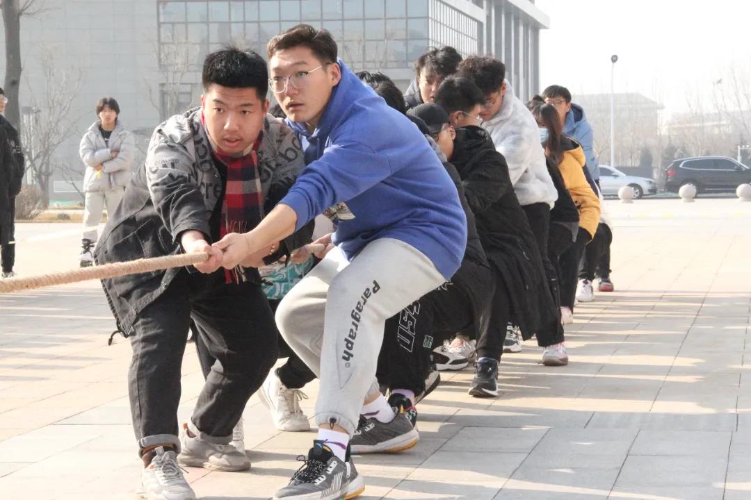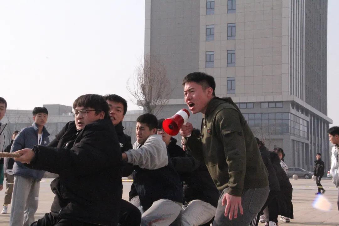 场上,指挥员引导参赛队员,队员们士气高昂、寸步不让,团结一致、齐心协力,眼睛死死盯住对手、双手稳稳拽紧绳子,脚步牢牢钉在地上,憋足劲拼命往后拉。“力拔山兮气盖世”,每一位参赛队员都将自己全部的力量灌注在拔河绳上,而每一个人的心也都紧紧地系在一起,为了集体的荣誉而奋力拼搏。