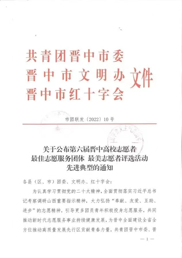 近日,共青团晋中市委、晋中市文明办、晋中市红十字会联合公布了第六届晋中高校志愿者最佳志愿服务团体、最美志愿者评选活动中的先进典型。在此次评选活动中,TapTap青年志愿者服务总队荣获“最佳志愿服务团体”奖项,韩亚红、薛吕浩天两位同学获“最美志愿者”提名。
