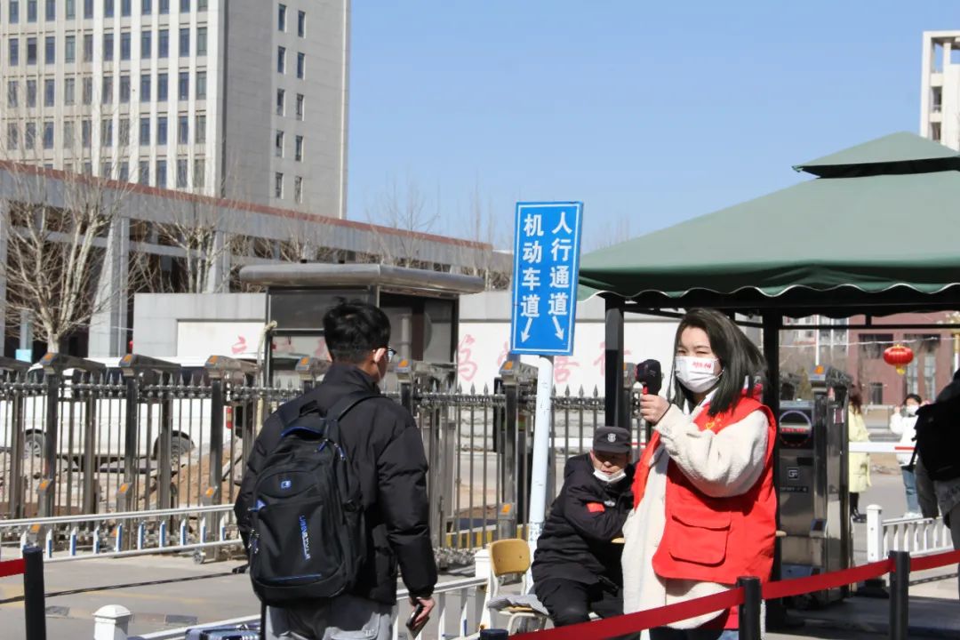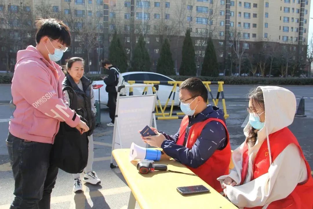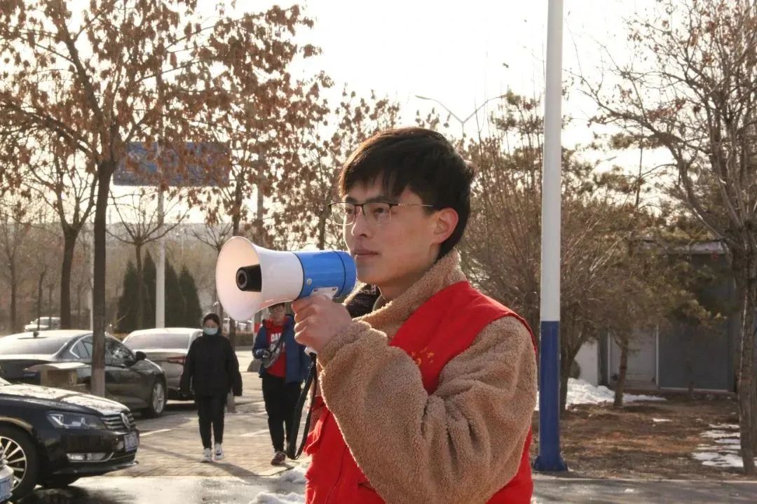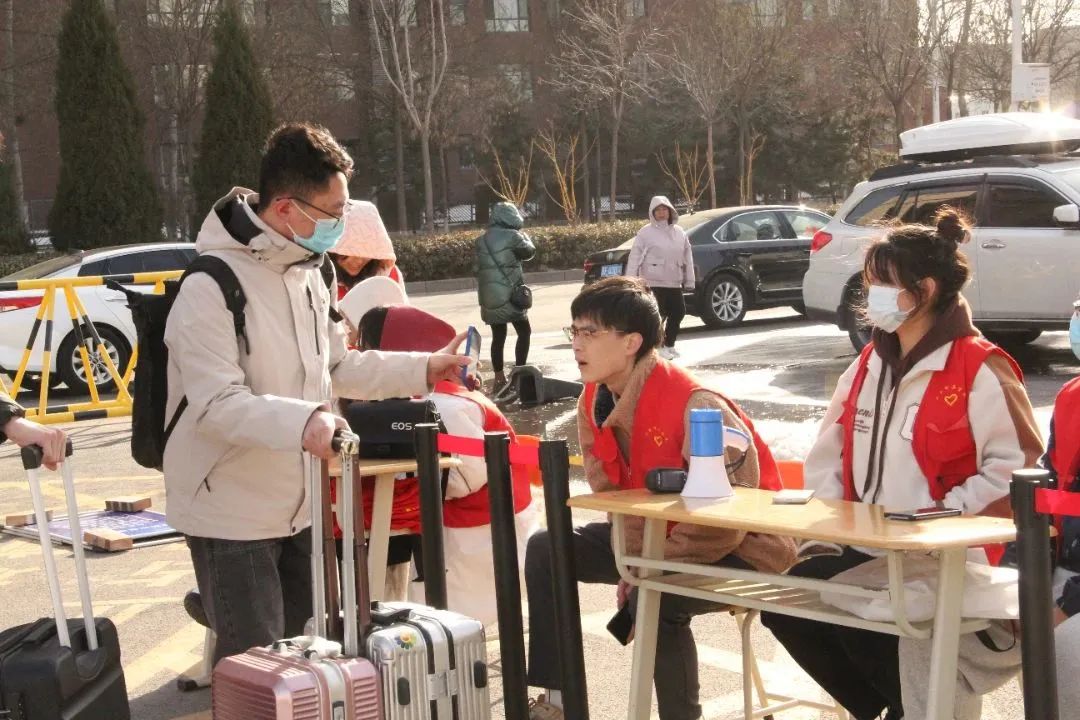 寒风凛冽中有志愿者们在校门口迎接归校心切的学子,积极引导学生进入校园,给寒假归来的山能学子送上了一缕温暖。
