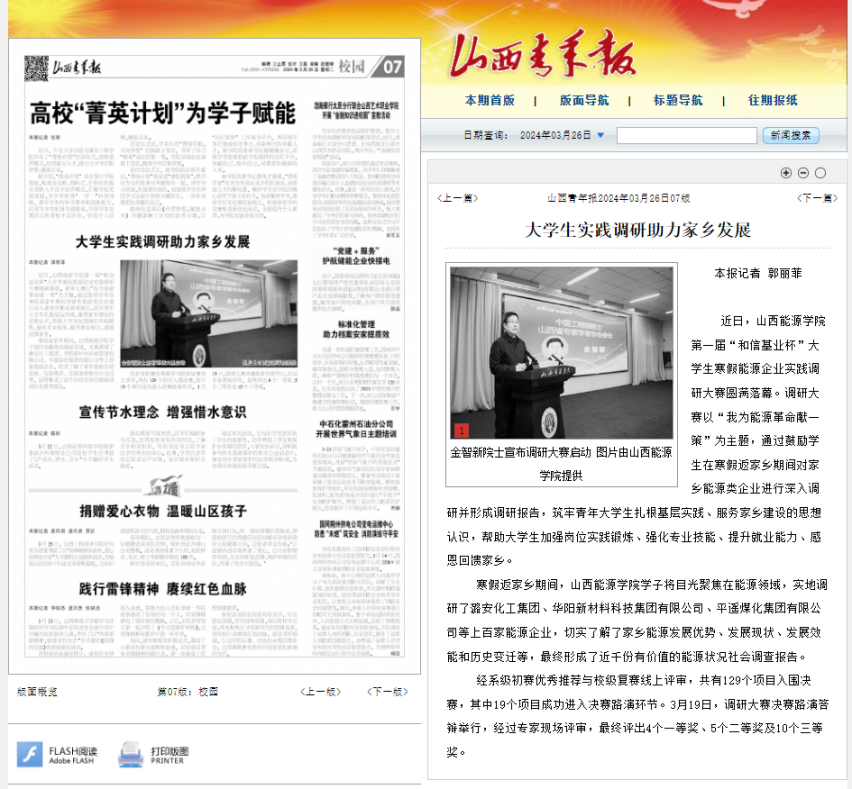 为了打造好“能源企业‘十百千’”特色品牌项目,在山西和信基业科技股份有限公司的支持下,举办了TapTap第一届“和信基业杯”大学生寒假能源企业实践调研大赛。此次活动聚焦能源产业、关注生态环境、对接国家战略,是TapTap积极践行习近平生态文明思想,主动对接“美丽中国”建设的重要举措。活动期间,TapTap学子利用春节假期及大学生寒假返乡时间,聚集在能源领域有资源禀赋的山西省十个地市,走访了百个县区,深入到各类能源企业中,运用所学专业知识,对企业的能源结构、节能减排措施、技术创新、环保政策执行等情况进行全面而细致的调研,最终形成了近千份有价值的山西能源状况社会调查报告。此次活动还得到了省内媒体——《山西青年报》的报道,充分彰显了TapTap在引导青年学子积极投身社会实践,助力国家能源战略实施方面的突出成效,展现了山能学子们的卓越才华和实践能力。
