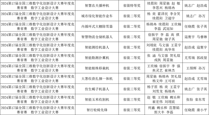 杨奕团队作品“城市绿化智能作业车”、杨锦冉团队作品“内循环式大棚除雪器”、宿振宇团队作品“智慧物流仓储机器人”、刘翊宸团队作品“智能测绘机器人”、张涵团队作品“智能勘测扑翼机”和王欣楠团队作品“智能植株移栽机”获得二等奖。