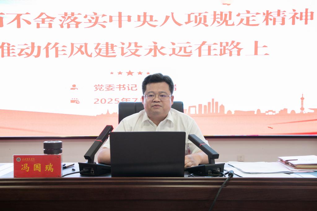 冯国瑞强调,要深入学习贯彻中央八项规定及其实施细则精神,持之以恒正风肃纪,以优良作风汇聚人心、凝聚力量,为推动学校高质量发展提供坚强保障。一是强化思想教育,筑牢作风建设的思想根基。加强对全校党员干部的思想教育和警示教育,引导党员干部知敬畏、存戒惧、守底线,切实增强贯彻落实中央八项规定精神的思想自觉和行动自觉。二是强化制度建设,扎紧作风建设的制度笼子。建立健全贯彻落实中央八项规定精神的制度体系,加强宣传教育,推动全体党员干部自觉遵守制度,坚决维护制度的权威性和严肃性。三是强化监督检查,织密作风建设的监督之网。加强对贯彻落实中央八项规定精神情况的监督检查,用好日常监督、重点监督、群众监督、媒体监督,持续提高监督的针对性和实效性,全方位筑牢作风防线。四是强化执纪问责,保持作风建设的高压态势。坚持把纪律挺在前面,对违反中央八项规定精神的行为,发现一起、查处一起。以严肃的问责倒逼责任落实,实现问责一个、警醒一片的效果。五是强化领导带头,发挥作风建设的示范作用。全校党员领导干部要以身作则、率先垂范,带头严格落实中央八项规定及其实施细则精神,严格落实领导干部作风建设考核评价机制,为广大党员干部树立榜样。