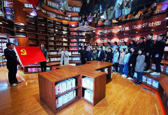 走进书房的主题空间“马克思大脑”,全体教师党员重温入党誓词。面对庄严的党旗,大家高举右手,铿锵有力地宣誓:“我志愿加入中国共产党,拥护党的纲领,遵守党的章程……”誓词在房间中回荡,彰显了党员的忠诚和信仰。宣誓结束后,大家坐在书丛中,品读红色书籍,感悟马克思的思想精髓和崇高精神,交流分享自己的学习心得。随后,大家在太原市图书馆广场开展“唱红歌”活动。