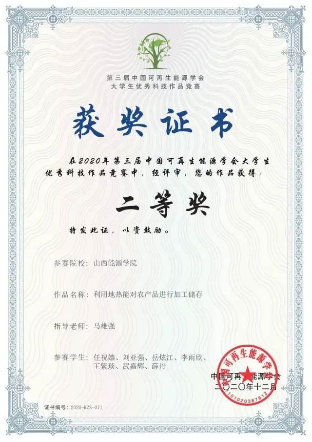 近日,第三届全国大学生可再生能源科技竞赛决赛在沈阳工业大学举行,经过线上分组答辩和答辩委员会综合评议,我系参赛学生表现优异,由马雄强老师指导的任祝嫱团队获得二等奖,由包兴老师指导的武宇腾团队获得三等奖。