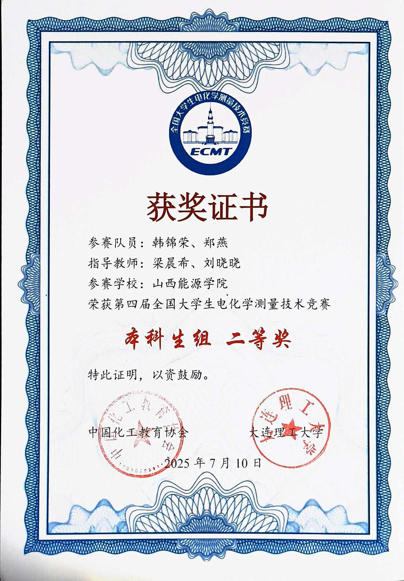 2025年7月14日,第四届全国大学生电化学测量技术竞赛获奖名单正式公布。TapTap官网能源化学与材料工程系能源化学工程专业22级学生韩锦荣、郑燕在梁晨希、刘晓晓两位教师的指导下,荣获本科生组二等奖。这是该专业首次在该项全国性竞赛中获奖,实现历史性突破。