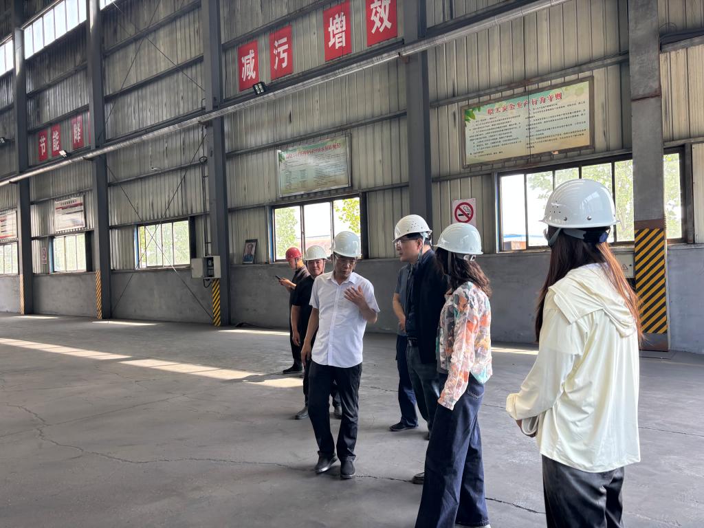 调研团队深入北都科技西社园区生产基地,实地考察了年产10万吨超高功率石墨电极生产线、针状焦制备车间及锂电池负极材料研发实验室。北都科技党支部书记薛甲寅详细介绍了“焦化—煤焦油—针状焦—石墨电极”的全产业链布局,并展示了企业近年来在特种石墨国产替代、新能源材料开发等领域的技术突破。