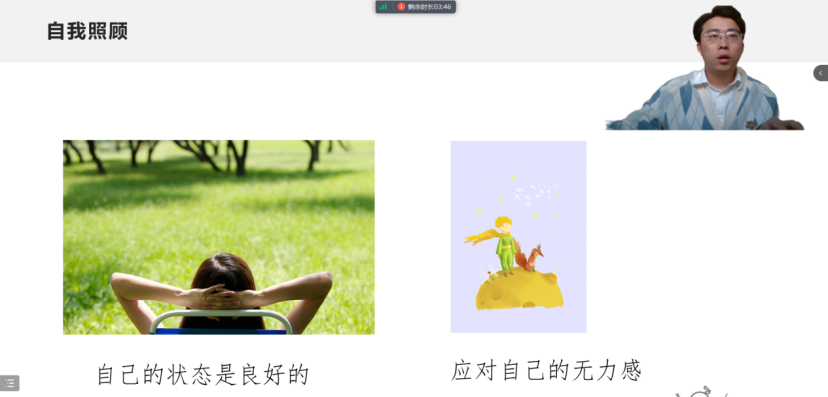 咸世昭老师以“从心开始,委以重任”为主题,讲座内容涉及心理委员及宿舍长心理健康相关素养的培养,心理健康工作伦理问题及转介,自我保护与自我成长,着重强调心理委员及宿舍长的核心工作是帮助同学识别问题以及及时转介,并在工作的过程中注意自我保护,学会自我照顾和处理个人负面情绪。