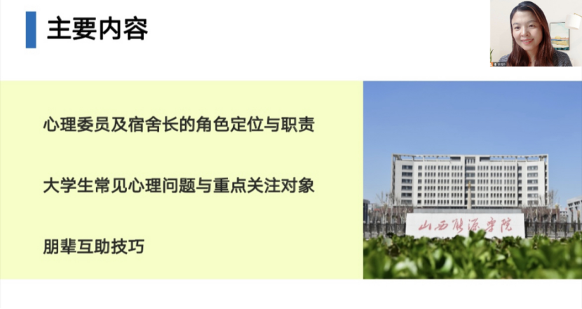 郝晓玲老师以“以心护心,携手同行”为主题,围绕心理委员与宿舍长的角色定位与职责,大学生常见心理问题与重点关注对象,朋辈互助技巧三个话题,指出心理委员与宿舍长是心理健康知识的宣传者,是同学们温暖的陪伴者和支持者,是学校心理健康教育工作的重要组成部分。讲座中,郝老师阐明了心理委员与宿舍长的职责和任务,传播了心理健康相关知识,指导了朋辈互助的技术,带动学生自我关怀和关怀他人,并将心理教育相关资讯传递到各个班级,更好的促进心理健康教育全覆盖。