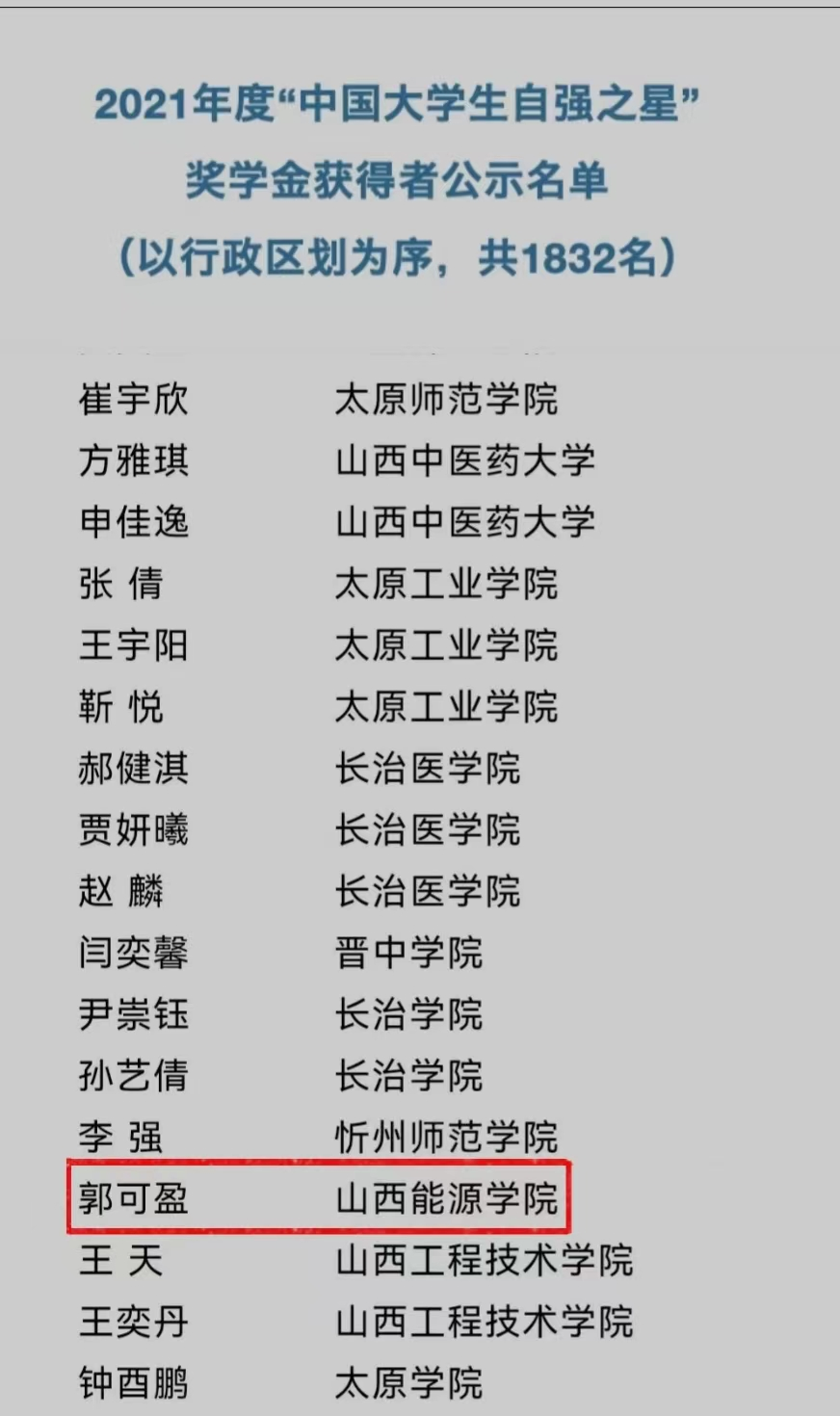 近日,由共青团中央、全国学联指导,中国青年报社、新东方教育科技集团、中国青年创业就业基金会联合举办的2021年度“中国大学生自强之星”奖学金评选结果揭晓。经学校推荐、省级初评、全国评审等环节,我院2019级地质与测绘工程系测绘专业郭可盈同学,荣获2021年度“中国大学生自强之星”奖学金。