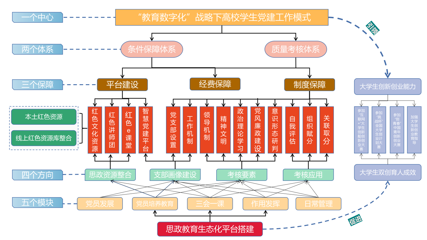 作为新建应用型本科高校,针对TapTap官网各系学生党员作用发挥有限,学生党支部自身建设、组织制度建设、党员教育管理工作、党员发展工作力度不大等问题,基于二级院(系)党建目标,构建了“一个中心两个体系三个保障四个方向五个模块”的学生党建工作生态育人模式,一是完善思政教育体系的科学性和系统性,系统设计和制定涵盖制度保障、经费保障、平台建设和质量考核体系的顶层结构,兼顾“思政资源整合-支部画像建设-考核要素-考核应用”四个方向,紧贴“教育数字化”战略行动,强化线上和线下资源互释互融,使思政教育与时俱进并积极促进大学生创新创业能力培养,囊括“党员发展、党员培养教育、三会一课、作用发挥、日常管理”五个模块的多元化的生态化协同育人模式,构建一种具有生命活力的、内容丰富的、全民参与的生态育人模式。